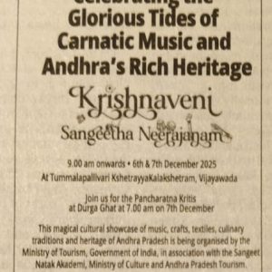 This festival highlights Andhra’s musical traditions—including Harikatha, Namasankeerthana, Veena repertoire, vocal concerts, and collective group presentations such as the Pancharatna Kritis—featuring renowned musicians, emerging talent, and students from leading music institutions across Andhra Pradesh and neighbouring states.