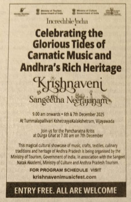The Ministry of Tourism, Government of India, in collaboration with the Ministry of Culture (Sangeet Natak Akademi) and Andhra Pradesh Tourism, presents the 2025 edition of Krishnaveni Sangeetha Neerajanam, scheduled on 6 and 7 December 2025 in Vijayawada, Andhra Pradesh.